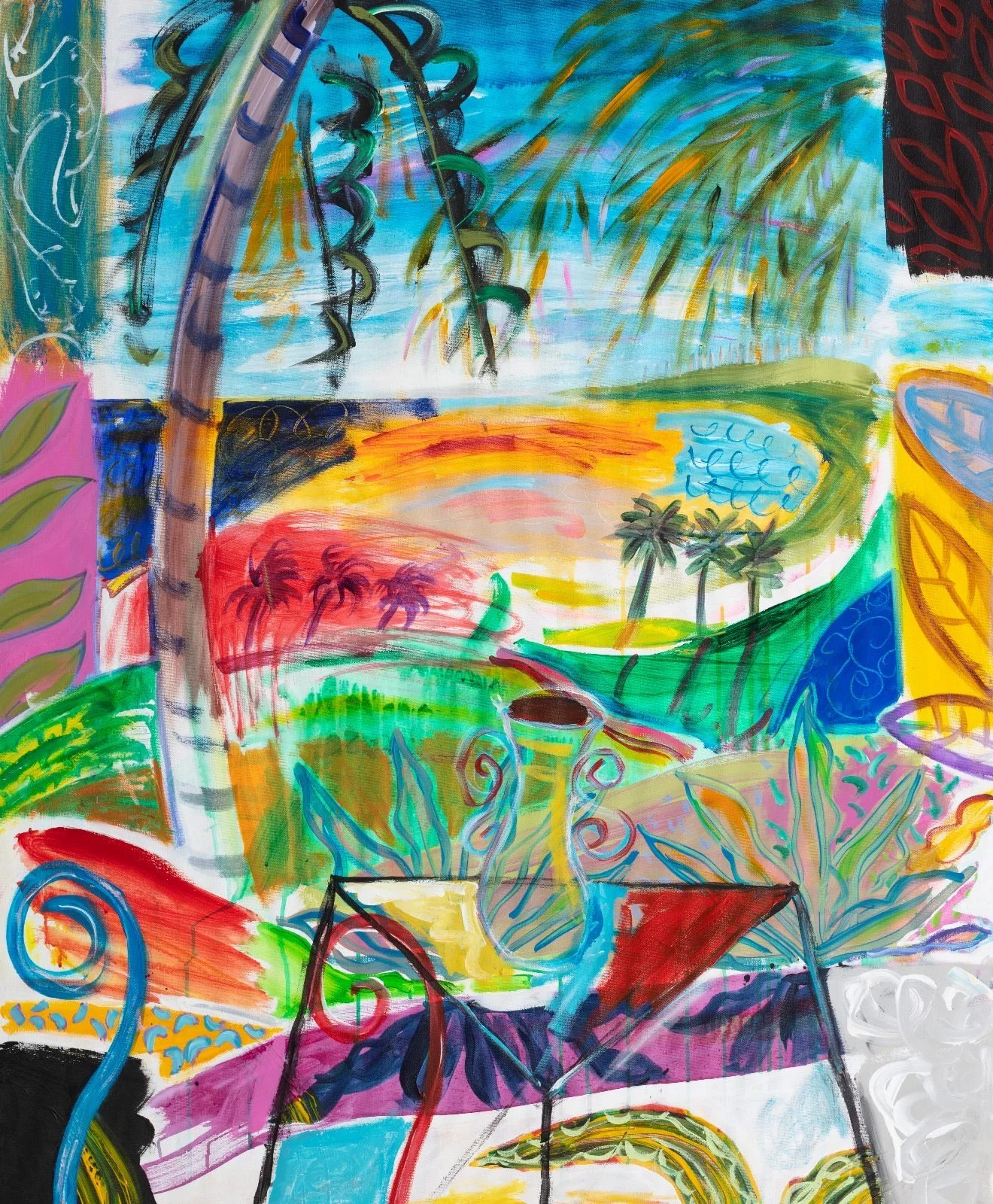 Watt's paintings blend structured form with raw emotion, producing works that are both architectonic and deeply human. Her figures and interiors are stylized yet spontaneous, imbued with rhythm and joy. Her artistic vocabulary draws from a rich lineage: he patterned surfaces of Gustav Klimt, the crisp stylization of Alex Katz, the flat yet expressive depth of Japanese woodblock prints, the sensuality of Gauguin's Tahitian women, and the Mediterranean light of David Hockney and Matisse. Her art is timeless, playful, and full of vitality. Watt favours acrylic paint, which allows for fast and spontaneous gestures. Transparent washes precede bold primary colours to create depth and vibrancy. Multiple motifs, all drawn from memory or imagination, are scattered throughout her work: highly stylized furniture; a picture within a picture; a torso – fragmented parts that, on their own, don't necessarily make sense, carefully placed to create a balanced whole.