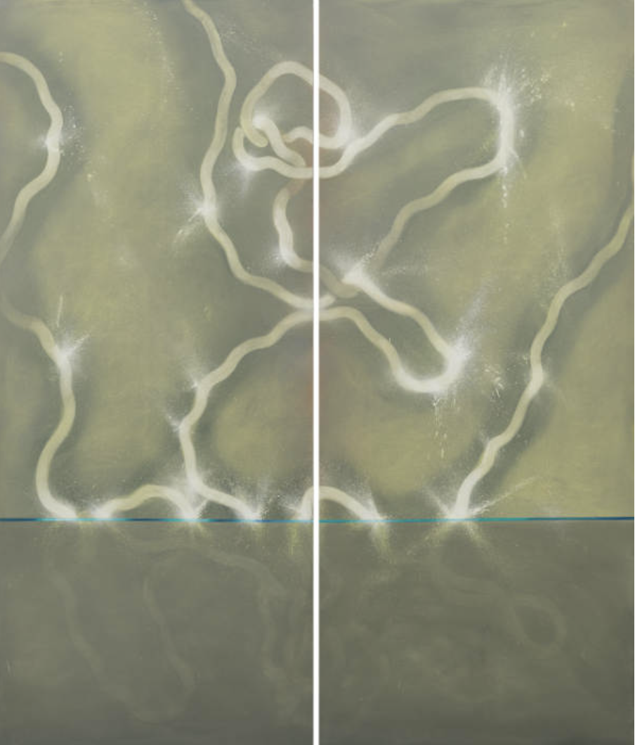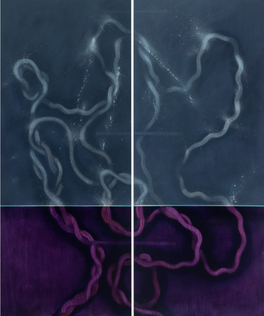 The “Locus of Being” series features a combination of expressive and structural elements that utilize a quantum character to achieve a certain splendor. They take recognizable effects from formal plateaus of past production yet extend them into a more elegantly complex composition. The notion of a quantum reality infuses them with profound significance. De la Haba takes the humble silhouette and places an ambivalent form dissembling before forming into something real —like an echo of a past event forever felt; like light refracted from distant stars; or a ripple in a pond following the same gravitational force that causes tsunamis, and places it at the service of painterly beauty. The spectator is placed in direct contact with an event that seems to have seemingly infinite potential. Whether it’s judged formally or metaphorically, it manifests archetypally to affect us in ways we have yet to comprehend. What we perceive in each image is kaleidoscopic, rendering into multiple meanings that do not allow facile deciphering. We enter the code of de la Haba’s vision, separated from reality by the liminality of vision. We become part of the locus, as our beings reflect the future of the work.