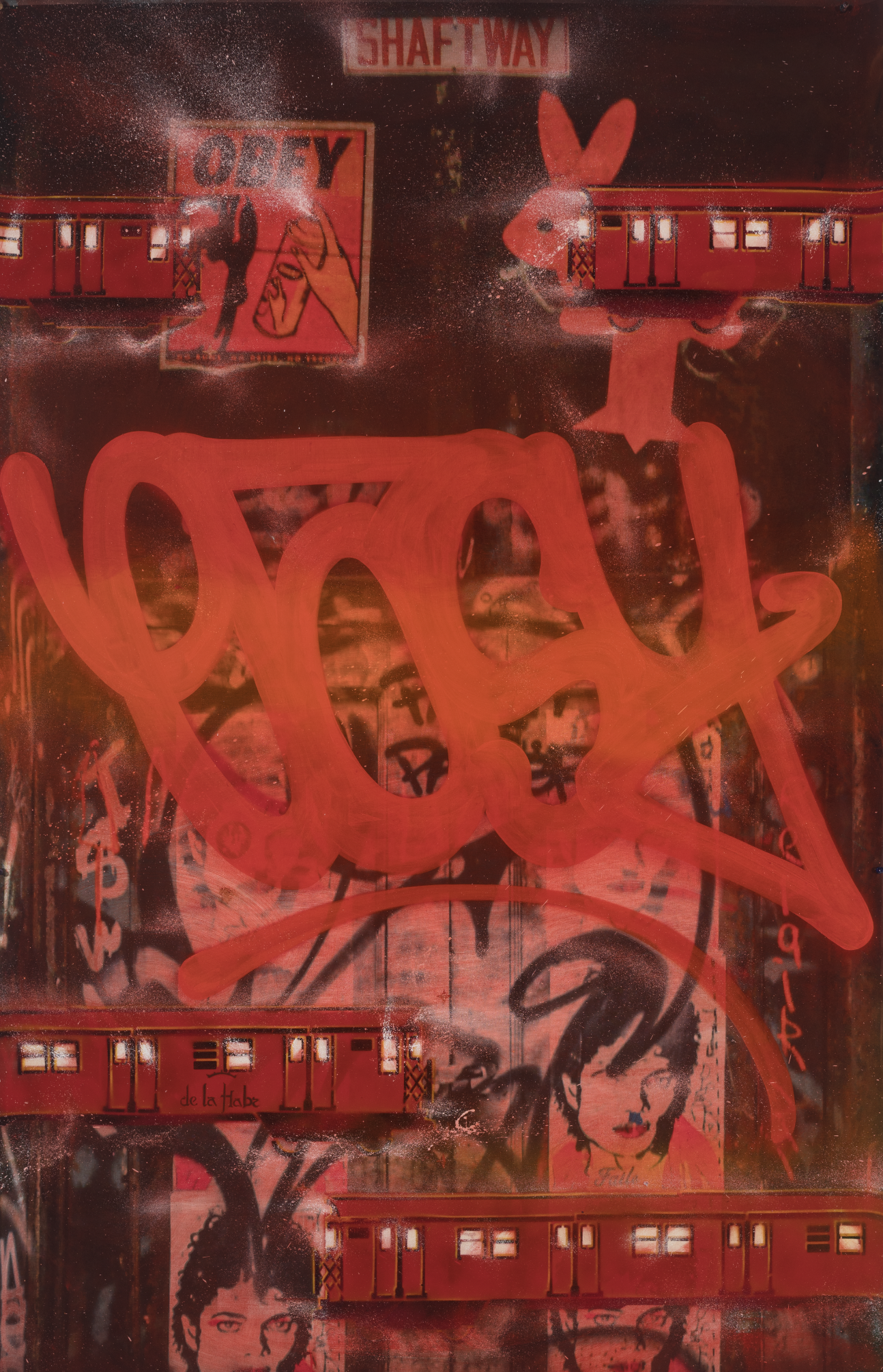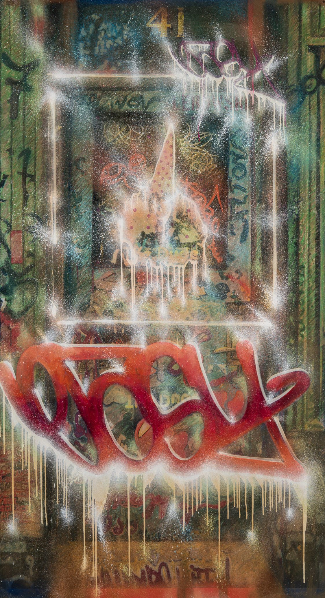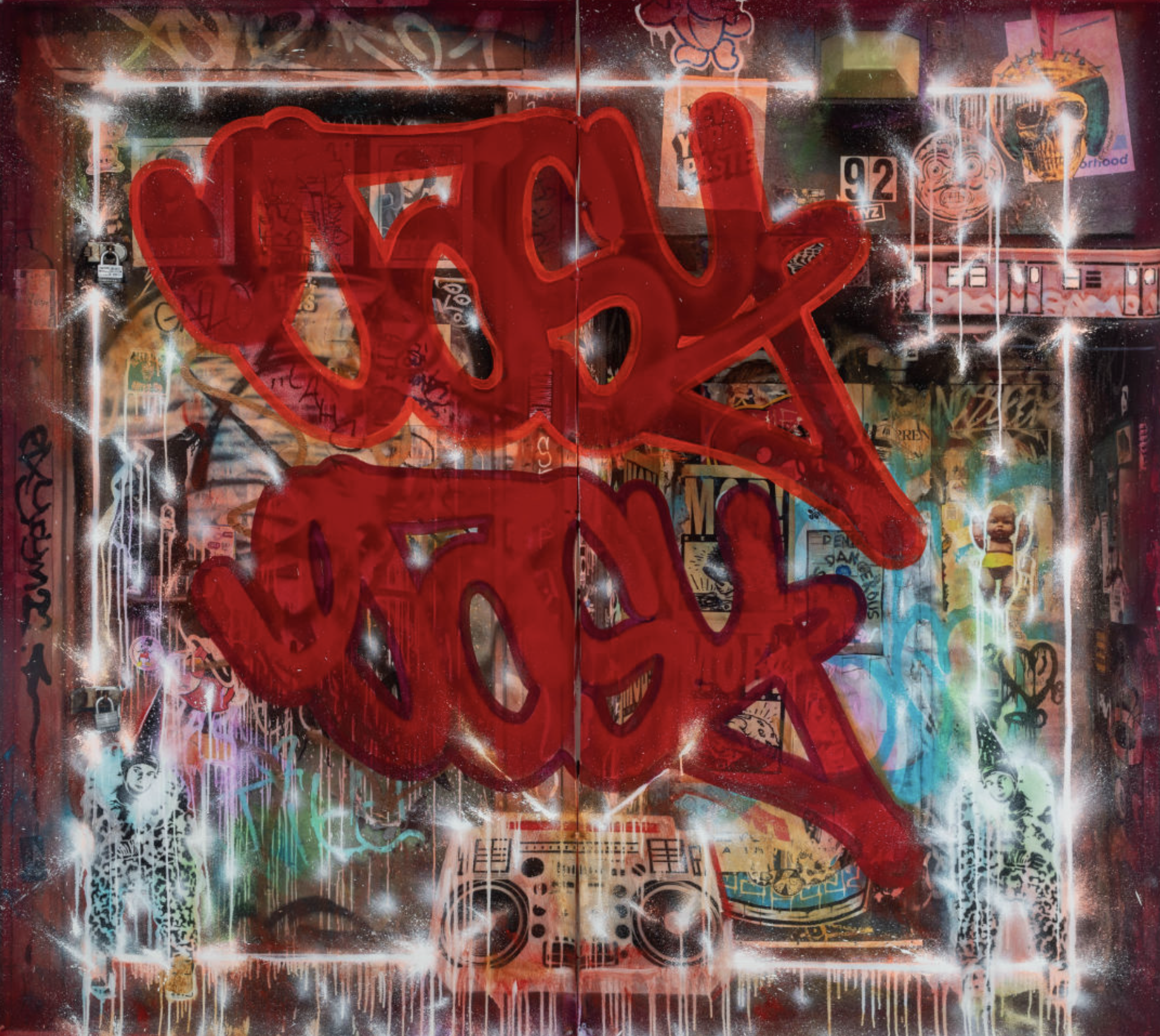 Oil, spray paint with Krink Markers on printed canvas