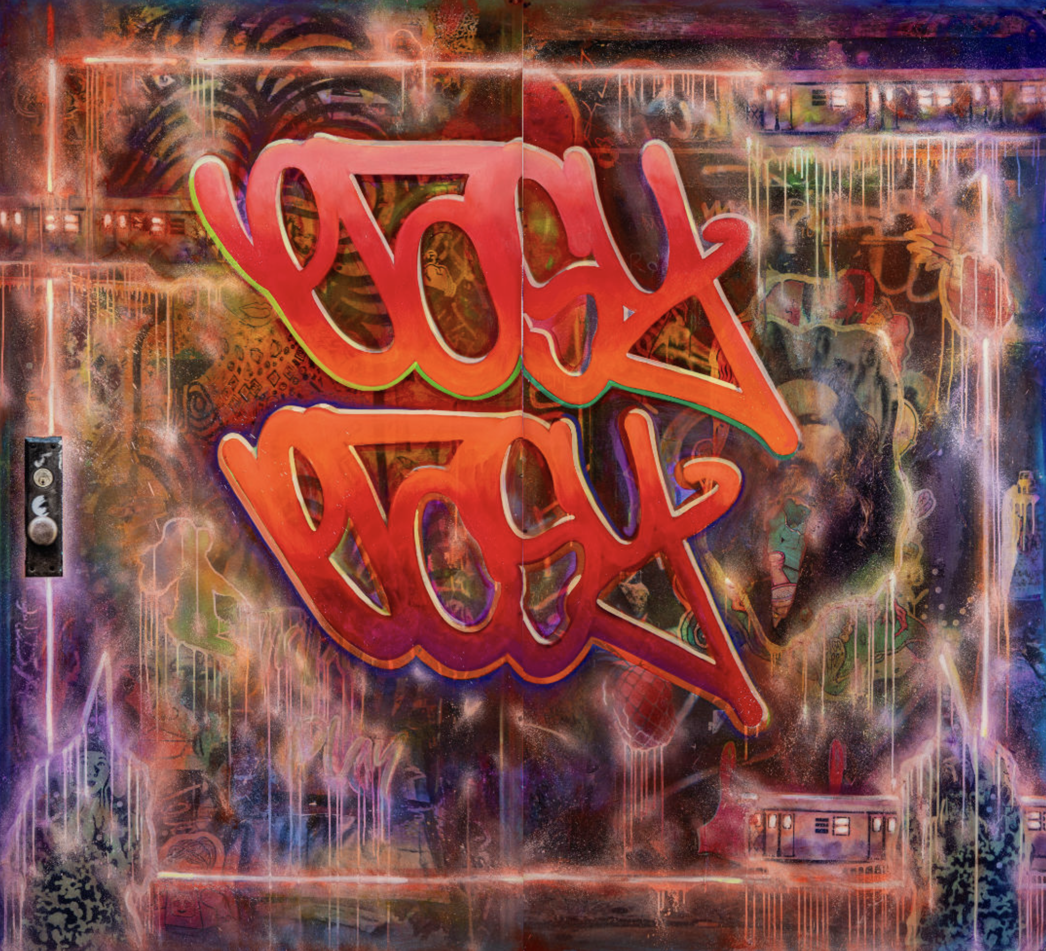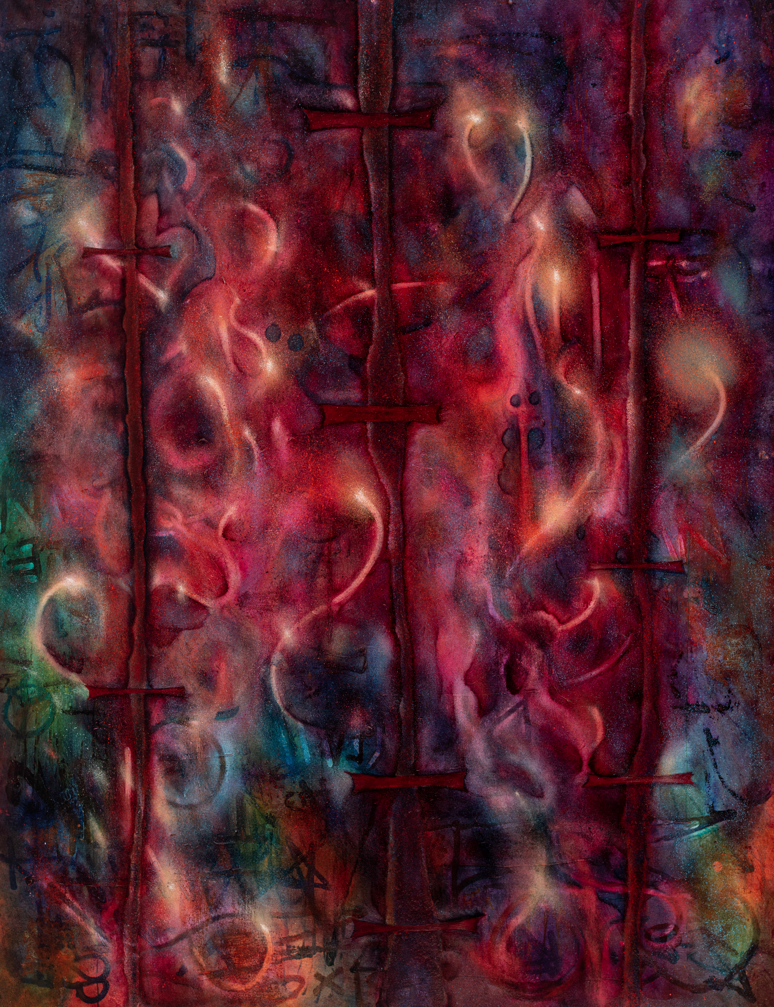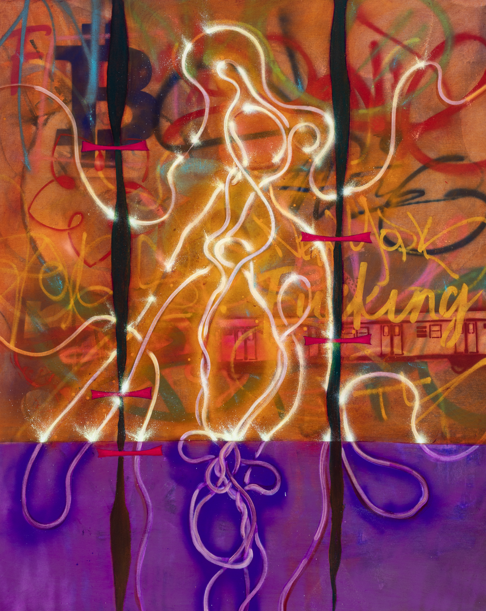 Oil, spray paint with Krink Markers on printed canvas