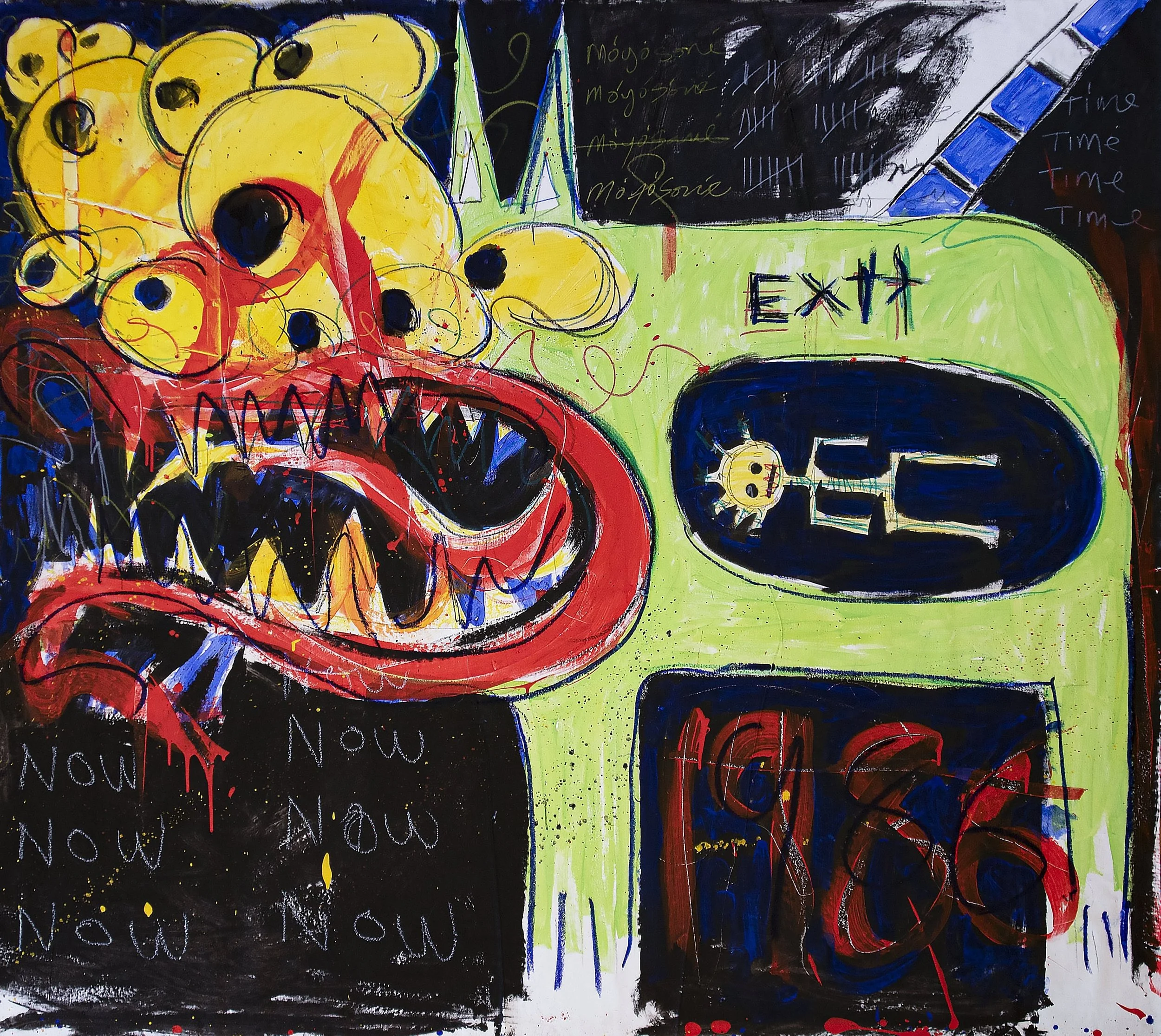 Móyò expresses the emotions of his characters with deft brushwork, setting them against backgrounds that are layered, manipulated, scratched, and infused with text. He places himself in the canvas in spirit, in name, and even through his birthdate. He scribbles words, mathematical formulas, mantras, and prayers. He visually expresses his internal conversation, which shifts as his world does as a visual biography. He resists being put in a box. His unique use of materials and story is the cord that ties his work together. As his craft and career expand, he looks back, reflecting on his path and where he has come from, both as a person and artistically. Entrenched with personal symbolism, every element of a painting has a purpose and a specific meaning to him, much like a morse code. The eyes symbolize his own spiritual “all-seeing”; the clusters of floating eyeballs convey the feeling of being constantly watched—of being 'seen,' both personally and through his work. The large, slightly aggressive mouth reflects the intensity of being talked about. Etched words serve as a mantra, a way to manifest his vision.