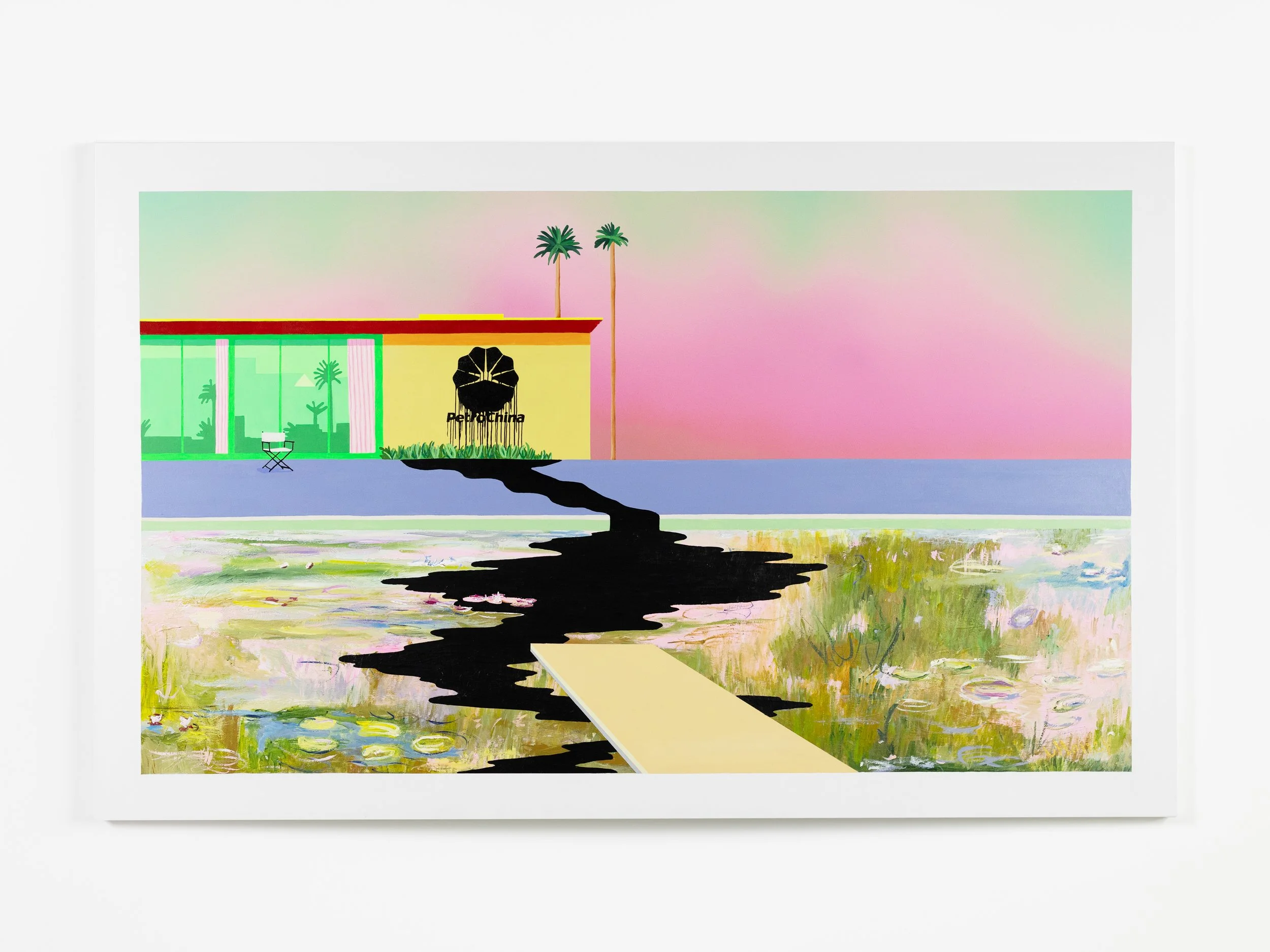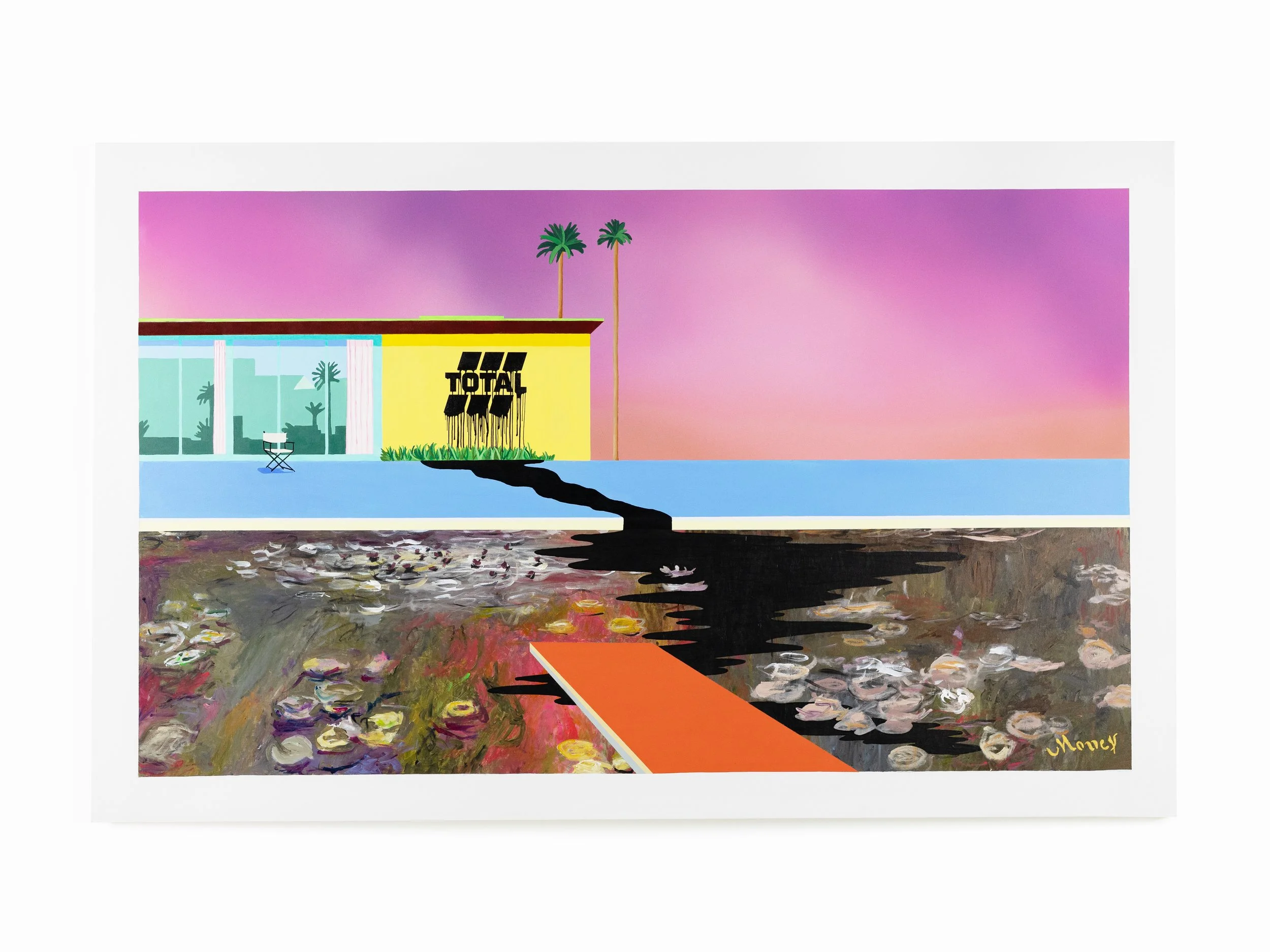 This series of four paintings revisits David Hockney’s “A Bigger Splash” with a critical dimension. Using Hockney’s technique and vibrant color palette, Zevs transforms the scene by adding logos of global oil companies on the white wall of the villa. These logos are ‘liquidated’, with paint dripping down like an oil spill into the pool. In a striking addition, Zevs introduces Monet’s Water Lilies into the pool, merging Hockney’s iconic Californian imagery with Monet’s representation of nature. While the blue of the pool and the white villa still reflect a certain idealized way of life, the Water Lilies also serve as a metaphor for exponential growth. Like real lilies, which can double their coverage daily, they evoke the rapid, uncontrolled expansion that parallels environmental and economic crises in a capitalist world.
