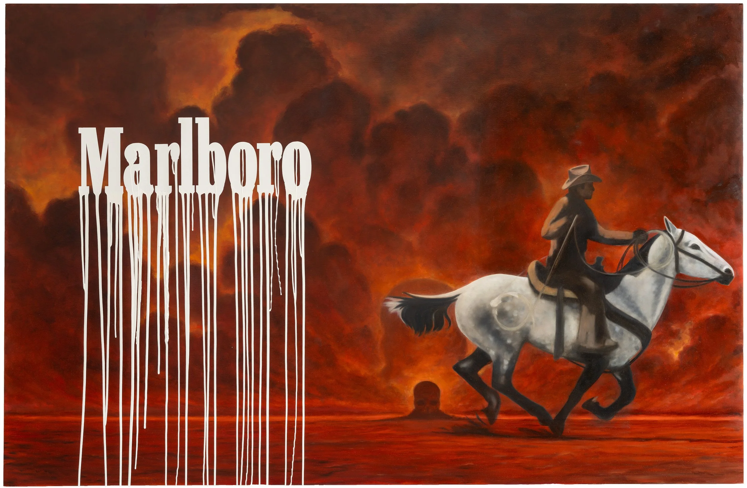 By reintroducing the liquidated Marlboro logo, Zevs transforms the cowboy into a symbol of a collapsing world. Positioned at the crossroads of history painting, capitalist critique, and dystopian cinema, these works blur the lines between art, advertising, and societal decay.