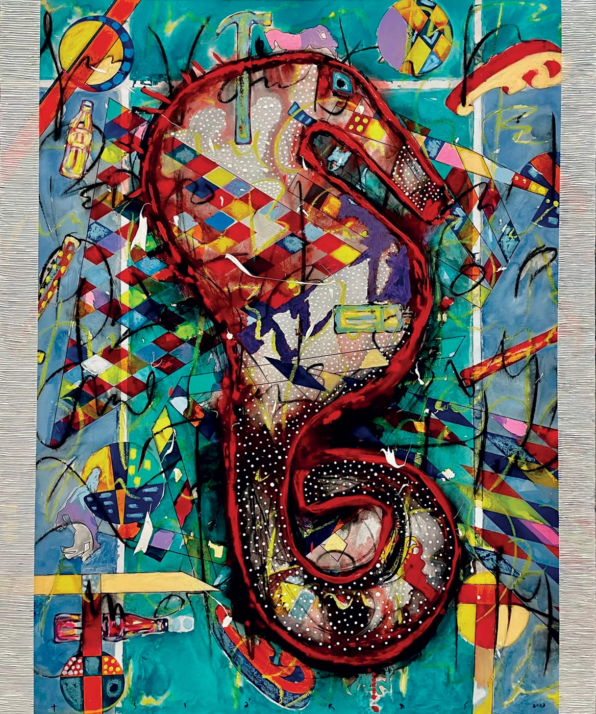 The Tsiaras’s “Topologies” begin with a geometric substructure, an underpainting of diamonds, squares, intersecting lines, and orbs. Tsiaras appears to purposely obscure the mythological, exalted subjects—whether an airplane, a head, a vase, or a horse—with rich layers of abstract painting while secretly revealing unexpected objects that emerge to ground the viewer in reality—a hammer, a French curve, a gun, a knife, or a bottle of Coca-Cola. Embedded throughout all the “Topologies” is Tsiaras's gestural handwriting, an intimate illegibility that art critic Donald Kuspit describes as "mysterious calligraphy, not unlike the Kufic writing in Medieval art." Kuspit adds, "In fact, Tsiaras succeeds in giving the objects a specific emotional tone—usually aggressive, but always with a libidinous dimension."